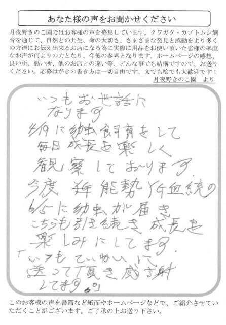 いつもお世話になります。4/19に幼虫飼育をして毎日成長を楽しく観察しております。今度、能勢YG血統の6/5に幼虫が届き、こちらも引き続き成長を楽しみにしてます。「いつもていねいに送って頂き感謝してます。」