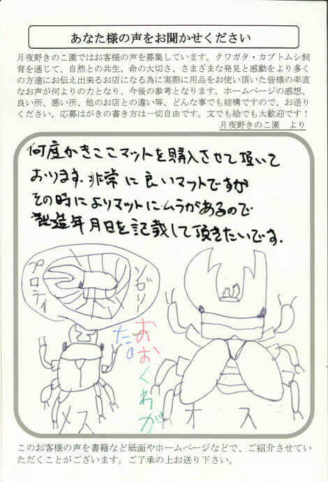 神奈川県 田中 様 10代 X Facebook はてブ LINE Pinterest コピー 2013.11.02 何度かきここマット購入させていただいて おります。非常に良いマットですが その時によりマットにムラがあるので 製造年月日を記載して頂きたいです。