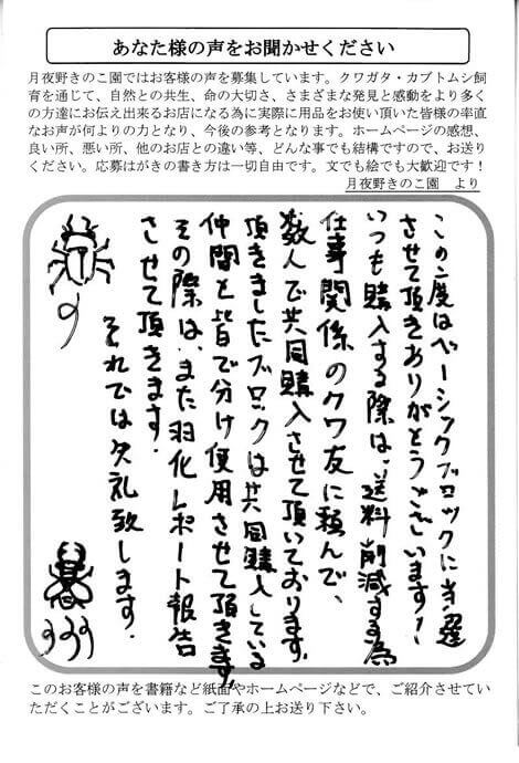 神奈川県 田中 様 Basic X Facebook はてブ LINE Pinterest コピー 2014.12.09 この度はベーシックブロックに当選 させて頂きありがとうございます! いつも購入する際は、総量削減する為 仕事関係のクワ友に頼んで、 数人で共同購入させて頂いております。 頂きましたブロックは共同購入している 仲間と皆で分け使用させて頂きます。 その際は、また羽化レポート報告 させて頂きます。 それでは失礼致します。