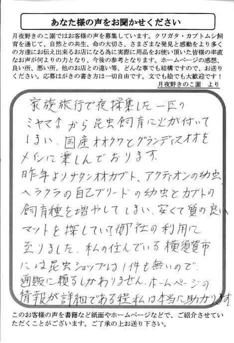 神奈川県 石渡 様 生体 X Facebook はてブ LINE Pinterest コピー 2015.10.17 家族旅行で夜採取した一匹の ミヤマ♂から昆虫飼育に火が付いて しまい、国産オオクワとグランディスオオを メインに楽しんでおります。 昨年よりサタンオオカブト、アクティオンの幼虫 ヘラクラの自己ブリードの幼虫とカブトの 飼育種を増やしてしまい、安くて質の良い マットを探していて、御社の利用に 至りました。私の住んでいる横須賀市 には昆虫ショップは1件も無いので、 通販に頼るしかありません。ホームページの 情報が詳細である程私は本当に助かります