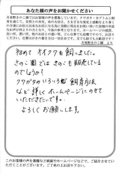 神奈川県 鈴木 様 ホームページ X Facebook はてブ LINE Pinterest コピー 2015.06.24 初めてオオクワを飼いました。 きのこ園ではきのこも販売している のでしょうか? クワガタのいろいろな飼育方法 など詳しくホームページにのせて いただきたいです。 宜しくお願いします