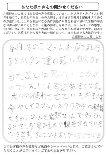 本日きのこマットが届きました。まさかクジ運が悪い自分が当たるとはおもっていなかったので天にも登る気持ちです。大切に使わせていただきます。今ヤエヤママルバネクワガタに飼育をきのこマットと完熟マットでやっているので、結果がでたら報告させていただきます。きのこマットありがとうございました。