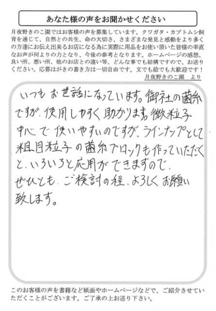 いつもお世話になっています。御社の菌糸ですが、使用しやすく助かります。微粒子中心で使いやすいのですが、ラインアップとして粗目粒子の菌糸ブロックも作っていただくと、いろいろと応用ができますので、ぜひとも、ご検討の程、宜しくお願い致します。
