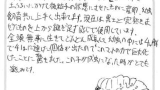 きのこMat50Lを購入しました。今飼っているアマミヒラタの幼虫とカブトムシの幼虫に使っています。到着した後にガス抜きを行い、クリアボトルやケースに入れて使っています。大きく育ってくれるとうれしいです。また、このように月夜野きのこ園をより良くしようとしているところも素敵だと思います。