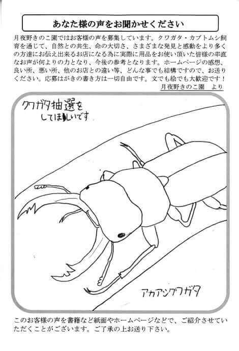 神奈川県 高野 様 イラスト X Facebook はてブ LINE Pinterest コピー 2014.11.17 クワガタ抽選をしてほしいです 【月夜野きのこ園】よりイラストありがとうございます。
