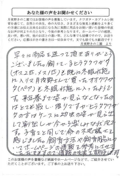 福井県 柳 様 50代 X Facebook はてブ LINE Pinterest コピー 2017.10.25 早々に商品を送って頂きありがとうございました。飼っているヒラタクワガタ(オス2匹、メス1匹)も既に冬眠状態に入り又月夜野さんで買ったオオクワガタ(ペア)も冬眠状態に入ったようです。来年春まで姿が見えなくなったのはとても寂しい限りですがヒラタクワガタの方はケースに幼虫の姿が見え出して割出しが今から楽しみな状況です。子育てと同じで命の不思議さを感じました。飼育方法や飼育用品についてホームページの情報を参考にさせていただきますので情報の充実を期待しています。