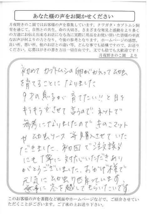 福岡県 山盛 様 きのこMat X Facebook はてブ LINE Pinterest コピー 2018.12.19 初めてカブトムシの卵がかえって幼虫を育てることになりました。9才の息子が育てたい!!と目をキラキラ☆させて言うので、ネットで参考になりましたので、きのこマットや幼虫ケース等購入させていただきました。初回で注文誤りにも丁寧に対応いただきありがとうございました。おかげ様で元気に幼虫7匹育っています。無事に冬を越してもらいたいです。