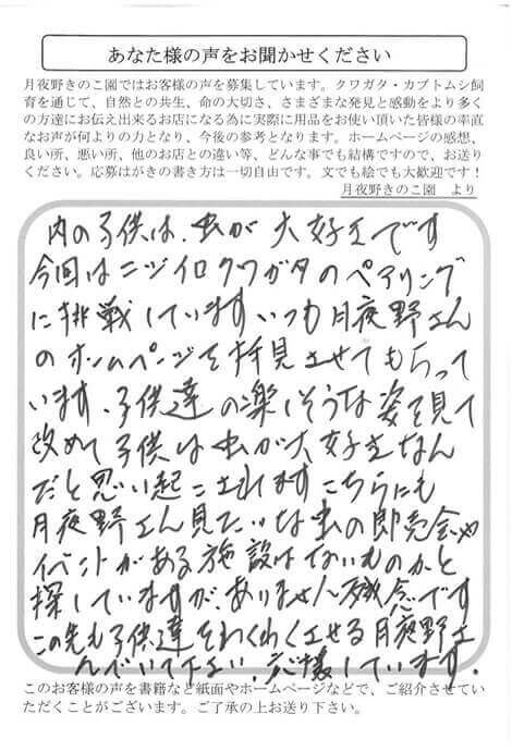 内の子供は虫が大好きです。今回はニジイロクワガタのペアリングに挑戦しています。いつも月夜野さんのホームページを拝見させてもらっています。子供達の楽しそうな姿を見て改めて子供は虫が大好きなんだと思い起こされます。こちらにも月夜野さん見たいな虫の即売会やイベントがある施設はないものかと探していますがありません。残念です。この先も子供達をわくわくさせる月夜野さんでいて下さい。応援しています。
