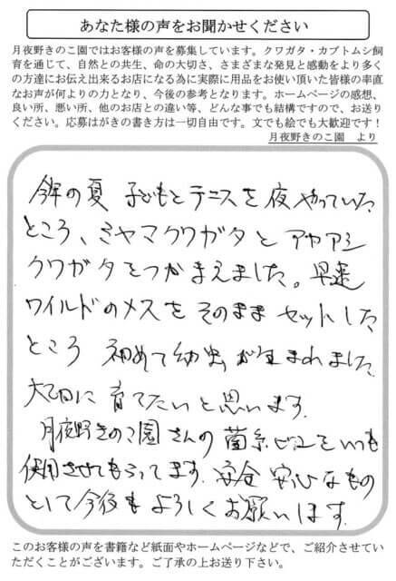 今年の夏、子どもとテニスを夜やっていたところ、ミヤマクワガタとアカアシクワガタをつかまえました。早速ワイルドのメスをそのままセットしたところ初めて幼虫が生まれました。大切に育てたいと思います。月夜野きのこ園さんの菌糸ビンをいつも使用させてもらってます。安全・安心なものとして今後もよろしくお願いします。
