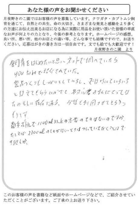 今年の夏、子どもとテニスを夜やっていたところ、ミヤマクワガタとアカアシクワガタをつかまえました。早速ワイルドのメスをそのままセットしたところ初めて幼虫が生まれました。大切に育てたいと思います。月夜野きのこ園さんの菌糸ビンをいつも使用させてもらってます。安全・安心なものとして今後もよろしくお願いします。