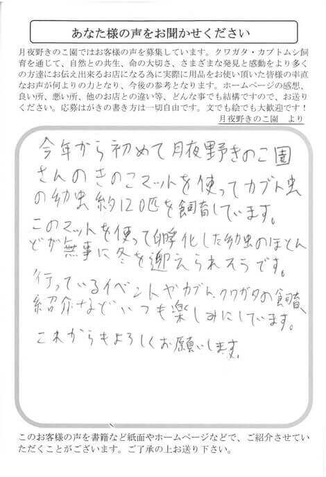 秋田県 髙橋 様 きのこMat X Facebook はてブ LINE Pinterest コピー 2018.12.06 今年から初めて月夜野きのこ園さんのきのこマットを使ってカブト虫の幼虫約120匹を飼育しています。このマットを使って孵化した幼虫のほとんどが無事に冬を迎えられそうです。行ってるイベントやカブト・クワガタの飼育紹介などいつも楽しみにしています。これからもよろしくお願いします。
