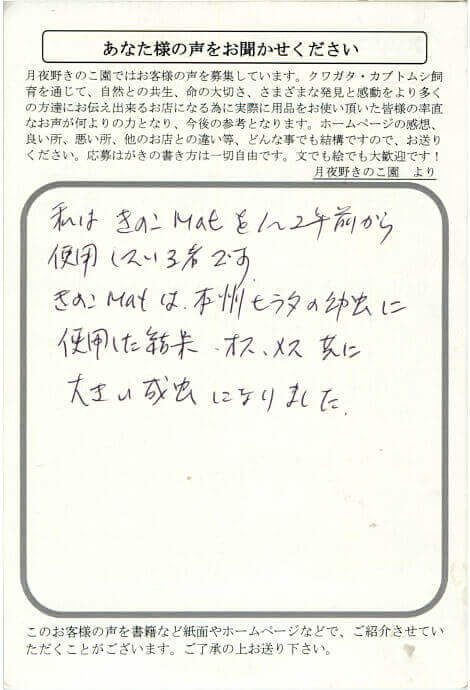 群馬県 上岡 様 きのこMat X Facebook はてブ LINE Pinterest コピー 2011.03.23 私はきのこMatを1~2年前から 使用している者です。 きのこMatは、本州ヒラタの幼虫に 使用した結果、オス、メス共に 大きい成虫になりました。