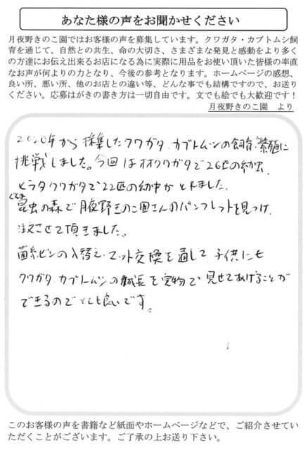 2020年から採集したオオクワガタ・カブトムシの飼育・繁殖に挑戦しました。今回はオオクワガタで26匹の幼虫、ヒラタクワガタで22匹の幼虫がとれました。くんま昆虫の森で月夜野きのこ園さんのパンフレットを見つけ、注文させて頂きました。菌糸ビンの入替え・マット交換を通して子供にもクワガタ・カブトムシの成長を実物で見せてあげることができるのでとても良いです。