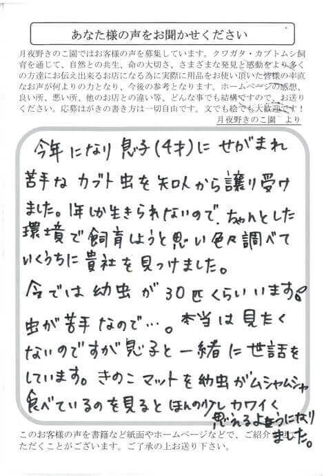 今年になり息子(4歳)にせがまれ苦手なカブト虫を知人から譲り受けました。1年しか生きられないので、ちゃんとした環境で飼育しようと思い色々調べていくうちに貴社を見つけました。今では幼虫が30匹くらいいます。虫が苦手なので…。本当は見たくないのですが息子と一緒に世話をしています。きのこマットを幼虫がムシャムシャ食べているのを見るとほんの少しカワイく思えるようになりました。