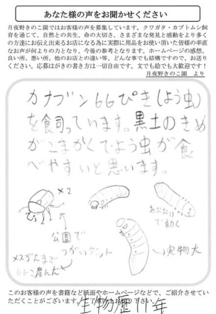 群馬県 坂東 様 イラスト X Facebook はてブ LINE Pinterest コピー 2023.10.282025.12.15 カナブン66ぴき(よう虫)を飼っています。黒土のきめがこまかくてよう虫が食べやすいと思います。