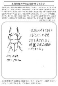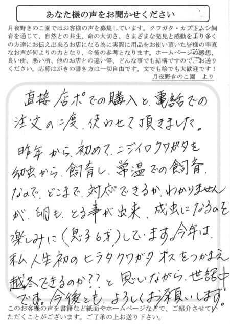 直接店ポでの購入と、電話での注文の二度使わせて頂きました。昨年から初めてニジイロクワガタを幼虫から飼育し、常温での飼育なので、どこまで対応できるかわかりませんが、卵もとる事が出来、成虫になるのを楽しみに(息子6才)しています。今年は私人生初のヒラタクワガタ・オスをつかまえ越冬できるのか??と思いながら世話中です。