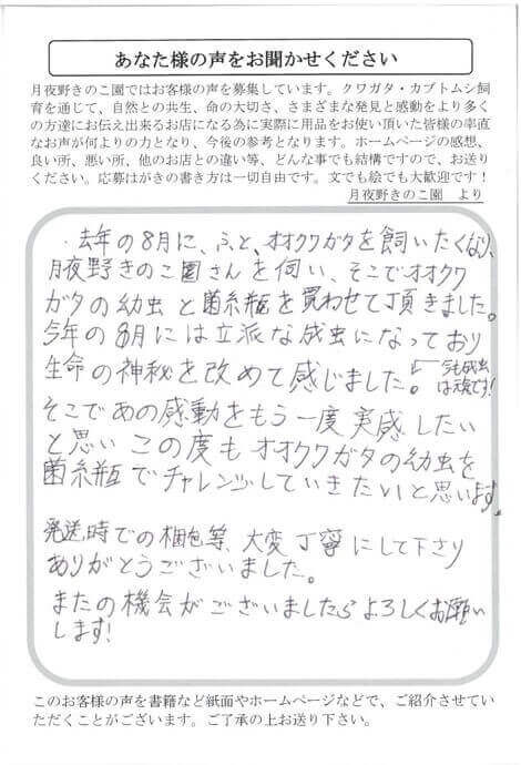 群馬県 木田 様 対応 X Facebook はてブ LINE Pinterest コピー 2017.09.06 去年の8月に、ふと、オオクワガタを飼いたくなり、月夜野きのこ園さんを伺い、そこでオオクワガタの幼虫と菌糸瓶を買わせて頂きました。 今年の8月には立派な成虫になっており姓名の神秘を改めて感じました。←今も成虫は元気です! そこであの感動をもう一度実感したいと思いこの度もオオクワガタの幼虫を菌糸瓶でチャレンジしていきたいと思います。 発送時での梱包等、大変丁寧にして下さりありがとうございました。 またの機会がございましたらよろしくお願いします!