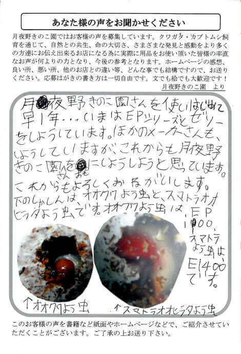 群馬県 横田 様 写真 X Facebook はてブ LINE Pinterest コピー 2014.11.29 月夜野きのこ園さんを使いはじめて 早1年・・・いまはEPシリーズとゼリー をしようしています。ほかのメーカーさんも、 しようしていますが、これからも月夜野 きのこ園さんをおもにしようしようと思っています。 これからもよろしくおねがいします。 下のしゃしんは、オオクワよう虫と、スマトラオオ ヒラタよう虫です。オオクワよう虫は、EP1100、 スマトラよう虫は、E1400です。