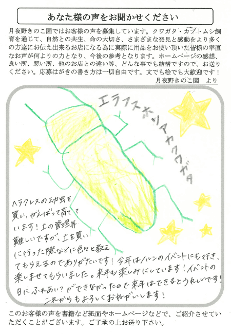ヘラクレスの幼虫を買い、がんばって育てています!土の管理等、難しいですが土を買いに行った際などに色々と教えてもらえるのでありがたいです!今年はノルンのイベントにも行き、楽しませてもらいました。来年も楽しみにしています!イベントの日にふれあい?ができなかったので来年はできるとうれしいです!これからもよろしくおねがいします!
