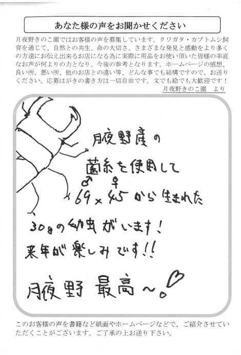 群馬県 関川 様 イラスト X Facebook はてブ LINE Pinterest コピー 2017.04.19 月夜野産の菌糸を使用して ♂69 × ♀45 から生まれた30gの幼虫がいます! 来年が楽しみです!! 月夜野最高~!