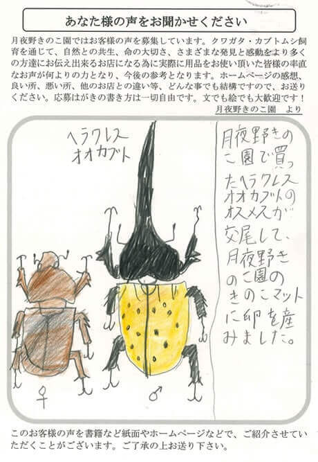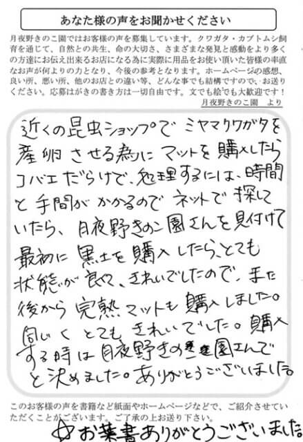 近くの昆虫ショップで、ミヤマクワガタを産卵させる為にマットを購入したらコバエだらけで、処理するには時間と手間がかかるので、ネットで探していたら、月夜野きのこ園さんを見付けて最初に黒土を購入したら、とても状態が良くてきれいでしたので、また後から完熟マットも購入しました。同じくとてもきれいでした。購入する時は月夜野きのこ園さんでと決めました。ありがとうございました。