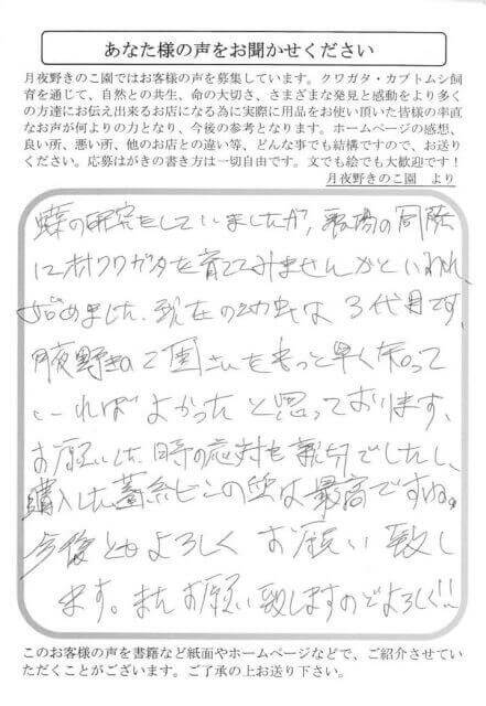 蝶の研究をしていましたが、職場の同僚にオオクワガタを育ててみませんかといわれ始めました。現在の幼虫は3代目です。月夜野きのこ園さんをもっと早く知っていればよかったと思っております。お願いした時の対応も親切でしたし、購入した菌糸ビンの質は最高ですね。今後ともよろしくお願い致します。またお願い致しますのでよろしく!!