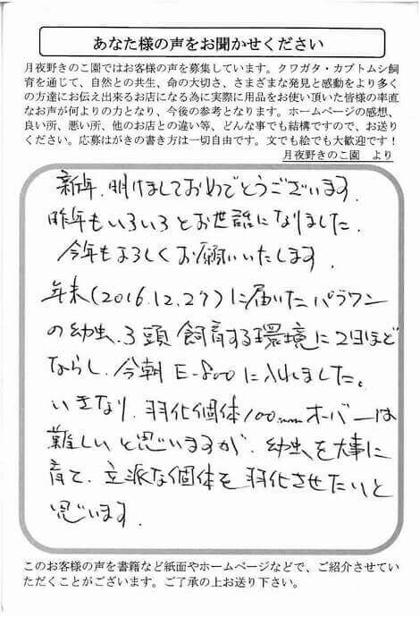 年末(2016.12.27)に届いたパラワンの幼虫3頭飼育する環境に2日ほどならし、今朝E-800に入れました。いきなり羽化個体100mmオーバーは難しいと思いますが、幼虫を大事に育て、立派な個体を羽化させたいと思います。