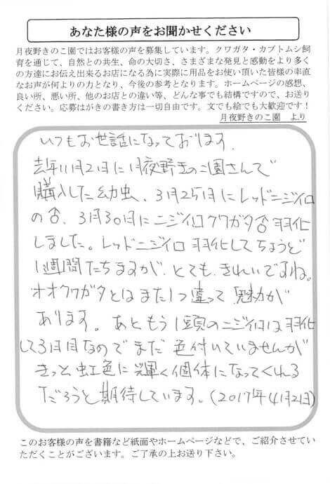 いつもお世話になっております。去年11月2日に月夜野きのこ園さんで購入した幼虫、3月25日にレッドニジイロの♂、3月30日にニジイロクワガタ♂羽化しました。レッドニジイロ羽化してちょうど1週間たちますが、とてもきれいですね。オオクワガタとはまた1つ違って魅力があります。あともう1頭のニジイロは羽化して3日目なのでまだ色づいていませんがきっと虹色に輝く個体になってくれるだろうと期待しています。(2017年4月2日)