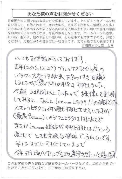 いつもお世話になっております。去年(2016.12.27)ブルックスポイント産のパラワンオオヒラタ幼虫E800付きを購入しましたが今年2017年10月18日羽化しました。今朝2週間以上たったので掘り出して計測してみると、なんと100mmピッタリ!!の個体でした。スマトラヒラタは何頭も羽化させていますが(最高90mm)パラワンヒラタははじめてで、まさか100mm個体が羽化するとは!!という感じでとても立派な個体でうれしいです。♀はすでに羽化しているので5月頃ペアリングをさせ産卵させたいと思います。