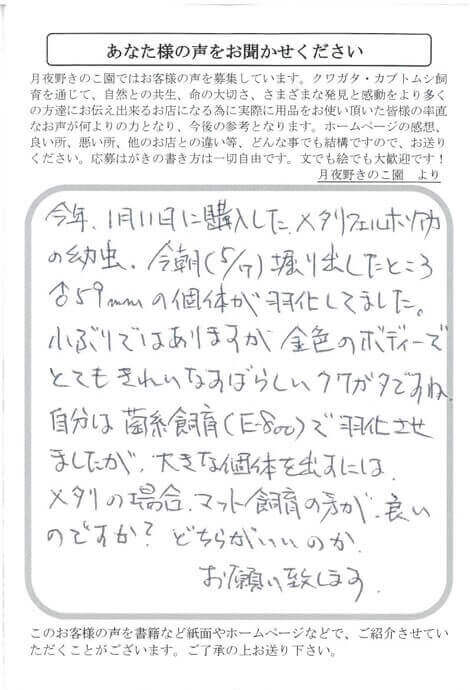 茨城県 天野 様 50代 X Facebook はてブ LINE Pinterest コピー 2018.05.16 今年、1月11日に購入したメタリフェルホソアカの幼虫、今朝(5/7)掘り出したところ♂59mmの個体が羽化してました。小ぶりではありますが金色のボディーでとてもきれいなすばらしいクワガタですね。自分は菌糸飼育(E-800)で羽化させましたが、大きな個体を出すには、メタリの場合マット飼育の方が良いのですか?どちらがいいのかお願い致します。