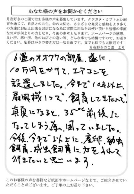 6畳のオオクワの部屋。遂に10万円をかけてエアコンを設置しました。今まで10年以上、扇風機1つで飼育してきたので真夏になると、35℃前後になってしまう為、困っていました。今後、今まで以上に産卵・幼虫飼育・成虫飼育に力を入れて行きたいと思います。