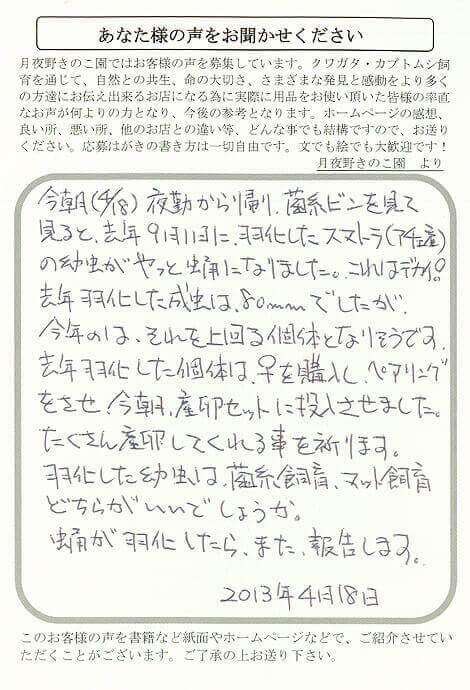 去年羽化した成虫は、80mmでしたが、