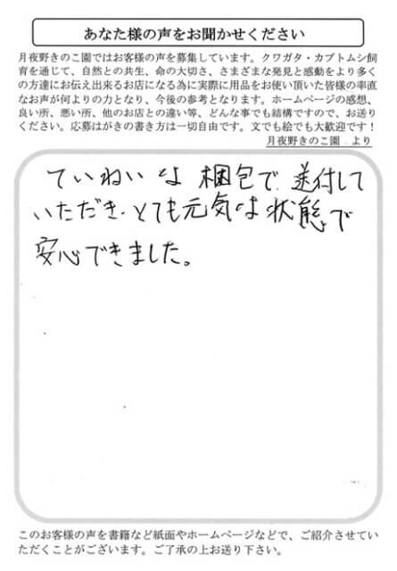 茨城県 小谷 様 梱包 X Facebook はてブ LINE Pinterest コピー 2021.11.182025.12.17 ていねいな梱包で送付していただき、とても元気な状態で安心できました。