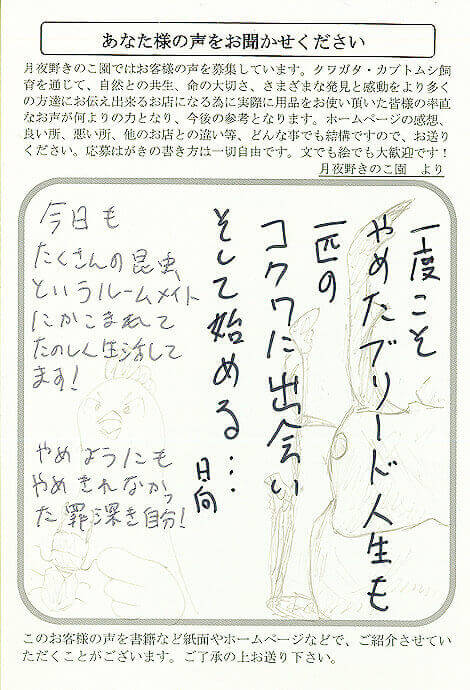 茨城県 日向 様 イラスト X Facebook はてブ LINE Pinterest コピー 2013.02.22 一度こそ やめたブリード人生も 一匹の コクワに出会い そして始める・・・ 日向 今日もたくさんの昆虫というルームメイトにかこまれてたのしく生活してます! やめようにもやまきれなかった罪深き自分!