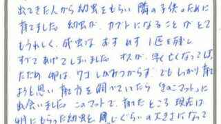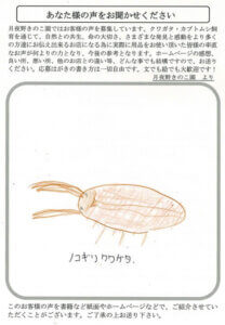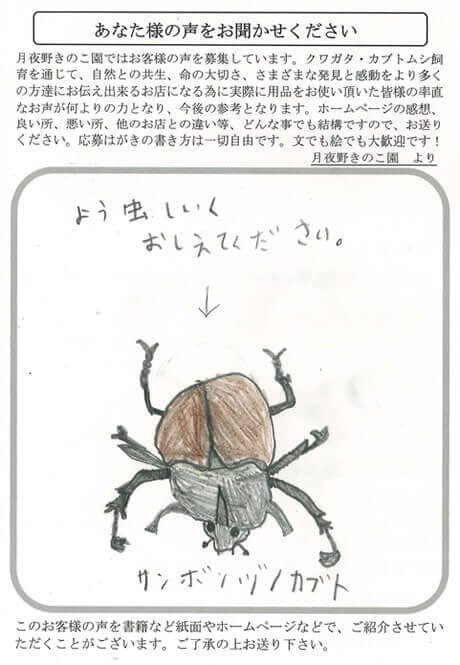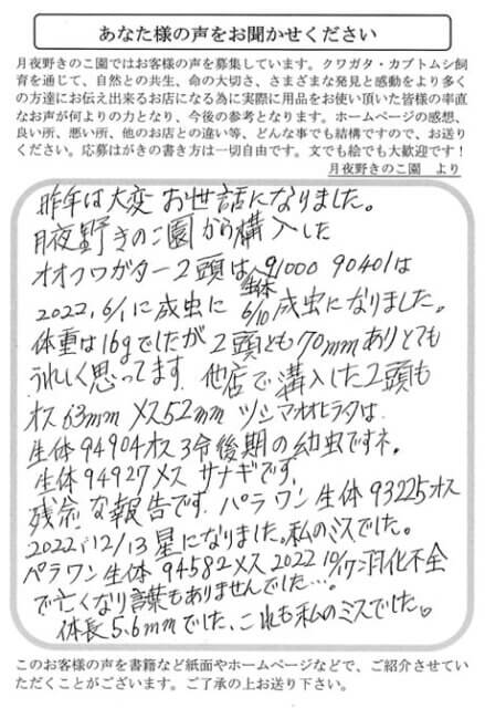 昨年は大変お世話になりました。月夜野きのこ園から購入したオオクワガタ2頭は生体91000・90401は、2022/6/1のに成虫に、6/10成虫になりました。体重は16gでしたが、2頭とも70mmあり、とてもうれしく思っています。他店で購入した2頭もオス63mm、メス52mm。ツシマオオヒラタ生体84804オス3令後期の幼虫ですネ。生体94927メス、サナギです。残念な報告です、パラワン生体93225オス、2022/12/3星になりました。私のミスでした。パラワン生体94582メス、2022/10/17羽化不全で亡くなり言葉もありませんでした…体長5.6mmでした、これも私にミスでした。