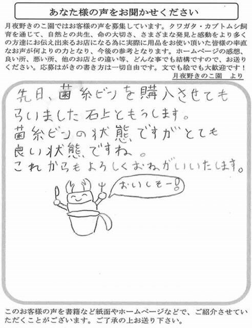 茨城県 石上 様 イラスト X Facebook はてブ LINE Pinterest コピー 2020.03.312025.12.17 先日、菌糸ビンを購入させてもらいました。菌糸ビンの状態ですが、とても良い状態ですね。