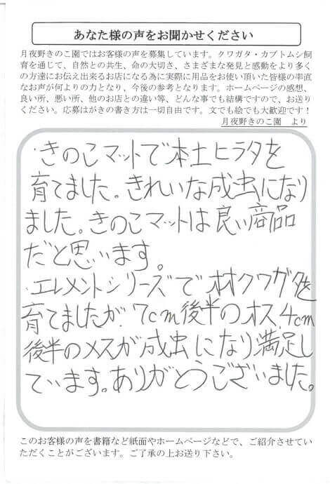 静岡県 稲葉 様 E-Block X Facebook はてブ LINE Pinterest コピー 2017.06.21 きのこマットで本土ヒラタを育てました。 きれいな成虫になりました。 きのこマットは良い商品だと思います。 エレメントシリーズでオオクワガタを育てましたが 7cm後半のオス、4cm後半のメスが成虫になり満足しています。 ありがとうございました。