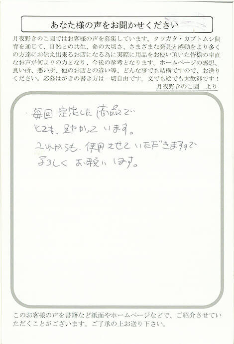 茨城県 西 様 安定供給 X Facebook はてブ LINE Pinterest コピー 2012.06.02 毎回安定した商品でとても助かっています。 これからも、使用させていただきますので 宜しくお願いします。