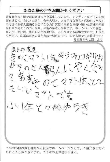 長崎県 戸塚 様 きのこMat X Facebook はてブ LINE Pinterest コピー 2014.03.25 息子より意見 きのこマットはギラファノコギリクワ ガタのさんらんにやくだっ てます。きのこマットは、とて もいいマットです。 小1年つかゆうき