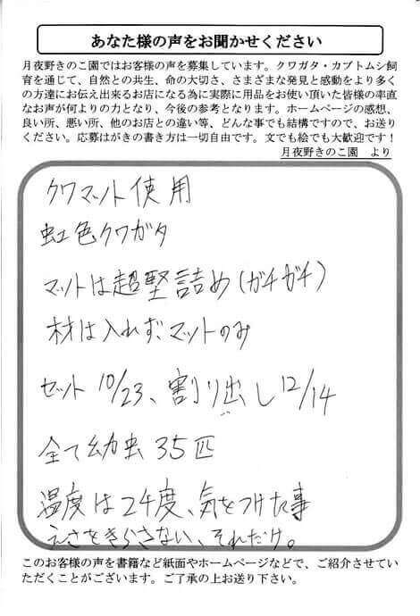 長崎県 松尾 様 くわMat X Facebook はてブ LINE Pinterest コピー 2014.12.19 クワマット使用 虹色クワガタ マットは超堅詰め(ガチガチ) 材は入れず、マットのみ セット10/23、割り出し12/14 全て幼虫35匹 温度は24度、気をつけた事 えさをきらない、それだけ。