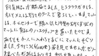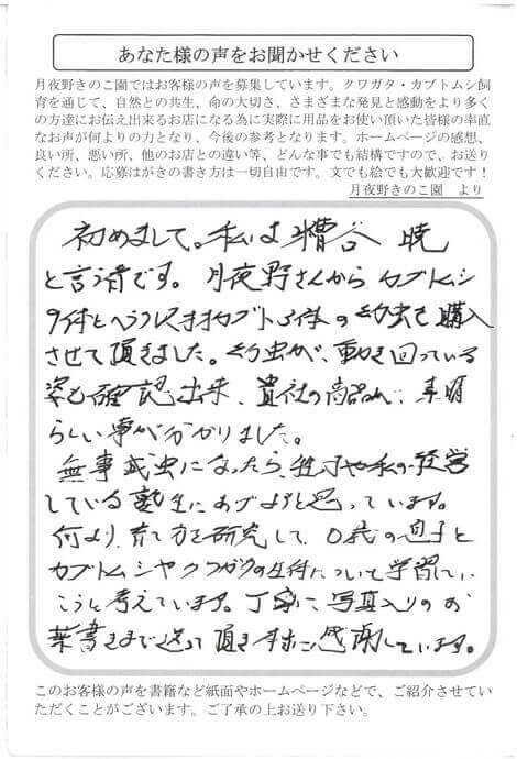 初めまして。私は糟谷暁と言う者です。月夜野さんからカブトムシ9体とヘラクレスオオカブト3体の幼虫を購入させて頂きました。幼虫が動き回っている姿も確認出来、貴社の商品が素晴らしい事がわかりました。無事成虫になったら、姪っ子や私の経営している塾生にあげようと思っています。何より、育て方を研究して0歳の息子とカブトムシやクワガタの生体について学習していこうと考えています。丁寧に写真入りのお葉書きまで送っていただき本当に感謝しています。