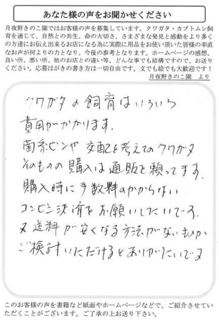 長野県 三宅 様 発送 X Facebook はてブ LINE Pinterest コピー 2021.05.272025.12.17 クワガタの飼育はいろいろ費用がかかります。菌糸ビンや交配を考えてのクワガタそのものの購入は通販を頼ってます。購入時に手数料のかからないコンビニ決済をお願いしたいです。又、送料が安くなる方法がないものかご検討いただけるとありがたいです。