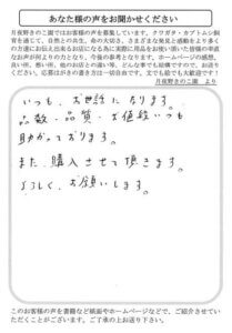 今年初めて貴社の菌糸を使わせていただきました。菌のまわりも大変よくて好印象です。来年の夏が楽しみです。国産オオクワガタメインに飼育しています。