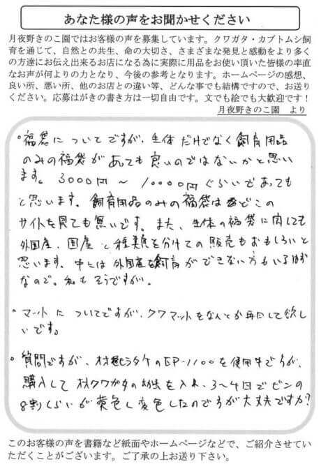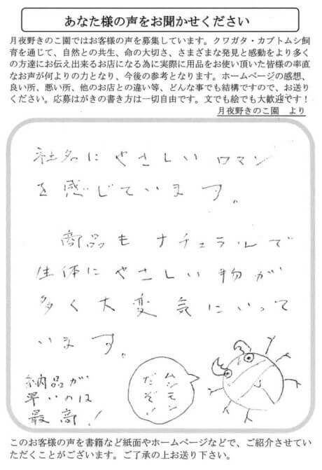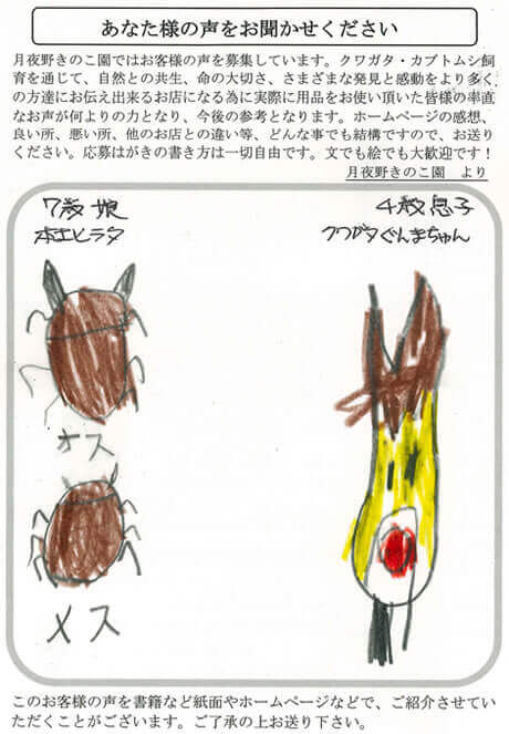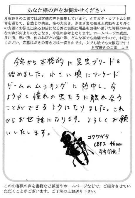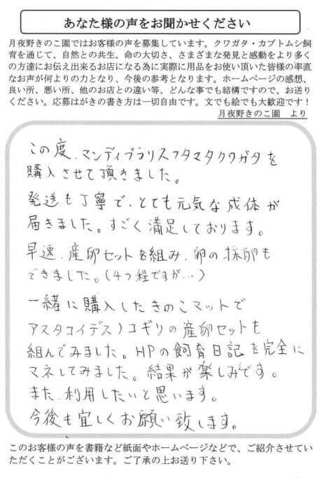 この度、マンディブラリスフタマタクワガタを購入させて頂きました。発送も丁寧で、とても元気な成体が届きました。すごく満足しております。早速、産卵セットを組み、卵の採卵もできました。(4つ程ですが…)一緒に購入したきのこマットでアスタコイデスノコギリの産卵セットも組んでみました。HPの飼育日記を完全にマネしてみました。結果が楽しみです。