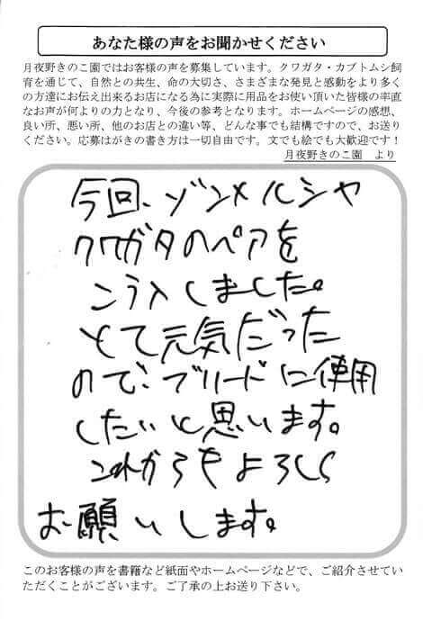 長野県 山田 様 生体 X Facebook はてブ LINE Pinterest コピー 2014.06.23 今回、ゾンメルツヤ クワガタのペアを こう入しました。 とて元気だった ので、ブリードに使用 したいと思います。 これからもよろしく お願いします。