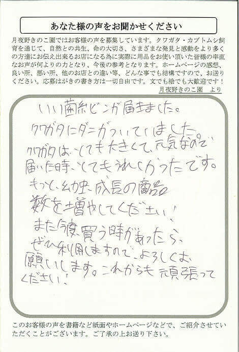 長野県 山田 様 生体 X Facebook はてブ LINE Pinterest コピー 2013.10.01 いい菌糸ビンが届きました。 クワガタにダニがついていました。 クワガタは、とても大きくて、元気なので 届いた時、とてもうれしかったです。 もっと幼虫成長の商品 数を増やしてください! また今度買う時があったら、 ぜひ利用しますので、よろしくお 願いします。これからも頑張って ください!