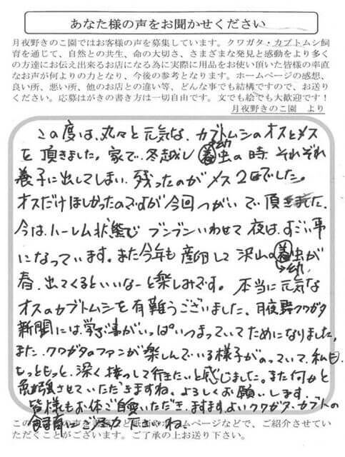 この度は、丸々と元気なカブトムシのオスとメスを頂きました。家で冬越し幼虫の時、それぞれ養子に出してしまい残ったのがメス2匹でした。オスだけほしかったのですが、今回つがいで頂きました。今は、ハーレム状態でブンブンいわせて夜はすごい事になっています。また今年も産卵して沢山の幼虫が、春出てくるといいなーと楽しみです。本当に元気なオスのカブトムシを有難うございました。月夜野クワガタ新聞には学ぶ事がいっぱいつまっていてためになりました。また、クワガタのファンが楽しんでいる様子がのっていて、私ももっともっと深く接して行きたいと感じました。また何かと勉強させていただきますね。よろしくお願いします。皆様もお体ご自愛いただき、ますますよいクワガタ・カブトの飼育にご尽力下さいね。