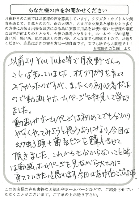 以前よりYouTube等で月夜野さんのことは知っていました。オオクワガタを育ててみたかったのですが、まったくの初心者だったので動画やホームページを拝見して学びました。動画やホームページは初めてで分かりやすくやってみようと思うようになり、今回は幼虫3頭+菌糸ビンを購入させて頂きました。これからも分からないこと等は動画・ホームページを見ながら大切に育てていきたいと思います。今回はありがとうございました。