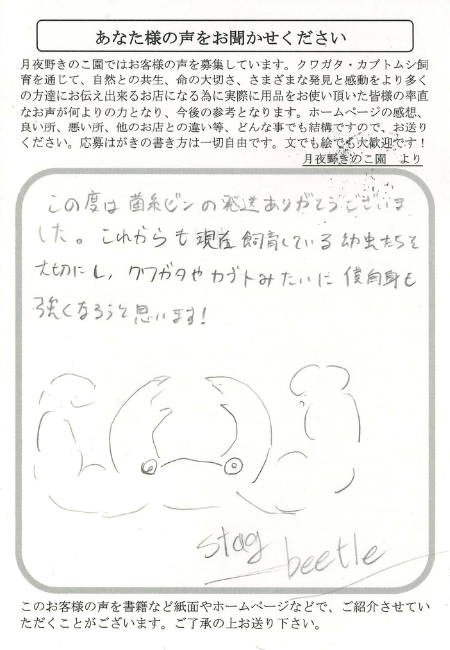 青森県 對馬 様 菌糸ビン X Facebook はてブ LINE Pinterest コピー 2024.11.282025.12.15 この度は菌糸ビンの発送ありがとうございました。これからも現在飼育している幼虫たちを大切にし、クワガタやカブトみたいに僕自身も強くなろうと思います!