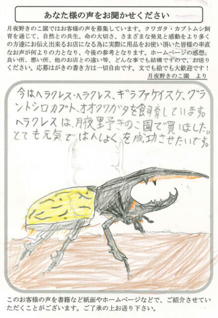 今はヘラクレス・ヘラクレス、ギラファケイスケ、グラントシロカブト、オオクワガタを飼育しています。ヘラクレスは、月夜野きのこ園で買いました。とても元気ではんしょくを成功させたいです。
